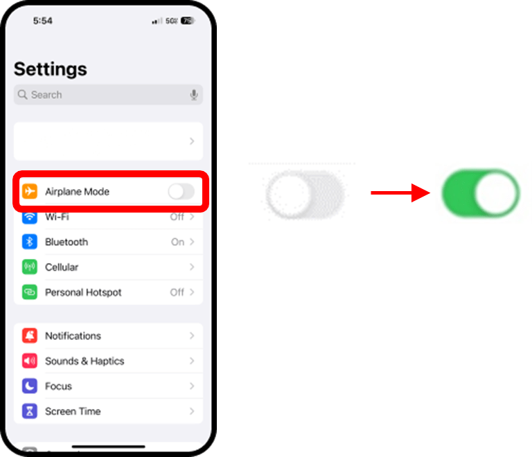 - En Settings (Configuración), localice Airplane Mode (Modo de vuelo) y toque el botón a la derecha para prender o activar la opción.