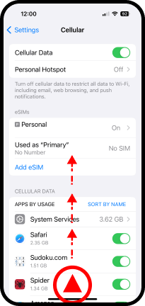 Settings (Configuración) → Cellular (Red celular) → Cellular Data (Datos celulares) → ![]()