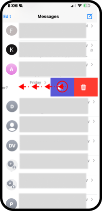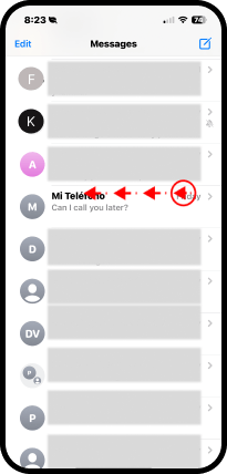 . - Coloque su dedo en el mensaje en el contacto y deslícelo hacia la izquierda. Observe que aparece un zafacón o bote basura.