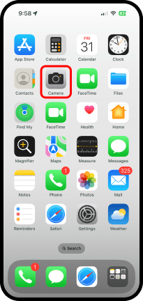 - Localice y toque la app Camera (Cámara) en la pantalla de inicio o toque Search (Buscar) y comience a escribir Camera (Cámara) en el encasillado con la lupa, toque
