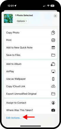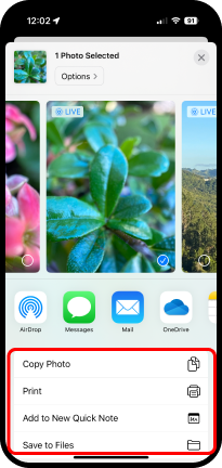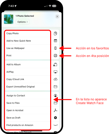 . El segundo grupo de acciones va a variar, pues depende de la app en que se encuentre. En la imagen aparece Photos (Fotos) y una lista de acciones relacionadas con fotos.