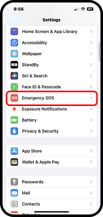 2. Toque Emergency SOS (Emergencia SOS), está más abajo en el listado de la pantalla Settings.