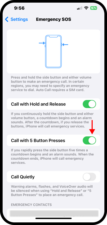 3. Deslice el botón al lado de Call with 5 button presses (Llamar con cinco presiones) hacia el lado derecho. Vea imagen a cotinuación.