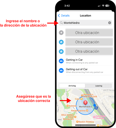 Vea la imagen de su recordatorio después de estas acciones, tiene un indicador que dice: Vea la imagen de su recordatorio después de estas acciones, tiene un indicador que dice: Arriving: Montehiedra (Al llegar a: Montehiedra).