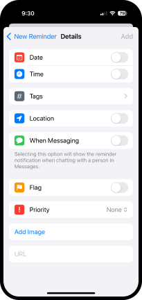 Con la app Reminders (Recordatorios) de iPhone se pueden crear recordatorios que le ayudan a organizar su día. Las opciones de la app aumentan las posibilidades de organización. Por ejemplo, puede recibir una notificación de su recordatorio en una fecha y hora específica o quizás al llegar a un lugar. Las opciones se encuentran en el área de Details (Detalles) o puede usar los atajos que aparecen sobre el teclado. En esta publicación se explican estas opciones.