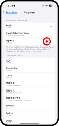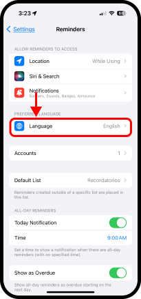 Settings (Configuración) → Reminders (Recordatorios) → Language (Idioma) → Español →cierre la pantalla
