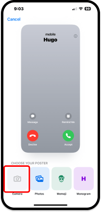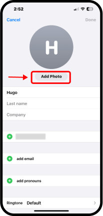 - Camera (Cámara) – se utiliza si va a utilizar la cámara del iPhone para tomar la foto que desea salga para identificar su contacto.