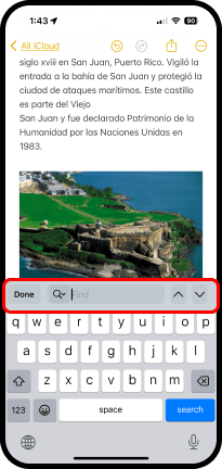 - Para buscar texto que haya entrado con el teclado o que haya escrito dentro de una nota, toque Find in Note (Buscar en la nota). En la pantalla aparece un teclado con la barra de las opciones de búsqueda.
