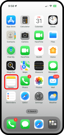 - Localice y toque la app Notes (Notas) en la pantalla de inicio o toque Search (Buscar) y comience a escribir Notes (Notas) en el encasillado con la lupa, cuando vea la app
