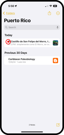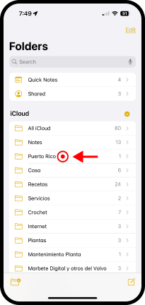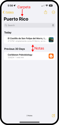 Aparece la pantalla de la carpeta Puerto Rico y las notas que se han creado ahí.