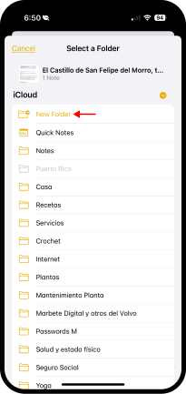 → Folders (Carpetas) → toque el nombre de la carpeta → toque el nombre de la nota