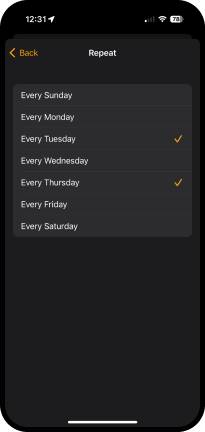 2. En la pantalla Repeat (Repetir), toque los días en que quiere que se active la alarma.  Por ejemplo, si desea que la alarma suene los martes y jueves, toque en Every Tuesday (Todos los martes) y en Every Thursday (Todos los jueves).