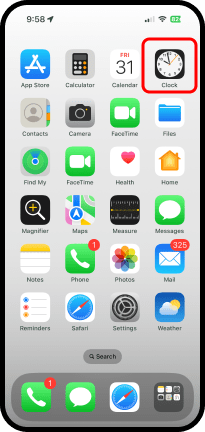 1. Localice y toque la app Clock (Reloj) en la pantalla de inicio o toque Search (Buscar) y comience a escribir Clock en el encasillado con la lupa, cuando vea la aplicación , tóquela.