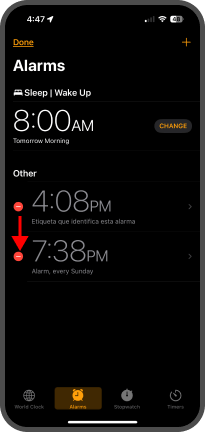 2. Toque la alarma que desea eliminar y deslice el dedo hacia la izquierda.