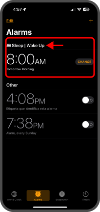 Si ha configurado una alarma desde otra aplicación, puede verla en la pantalla Alarms (Alarmas), pero la tiene que eliminar donde la creó. Fíjese en la alarma enmarcada en la imagen, es una alarma creada en la aplicación Health (Salud) y no la podrá eliminar con los pasos descritos.