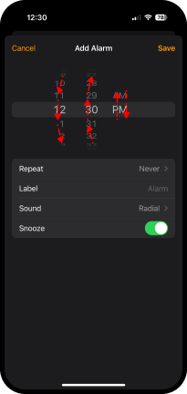 1. Toque y deslice su dedo por las ruedas giratorias de la hora, los minutos y el meridiano para fijar la hora en que se activará la alarma.