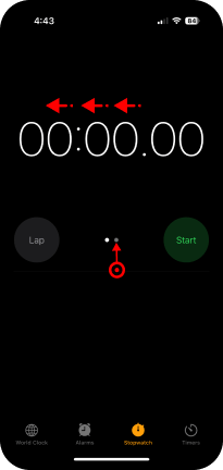 - El cronómetro tiene dos apariencias. Para intercambiar entre ellos, toque el cronómetro y deslice el dedo hacia la izquierda o la derecha según sea necesario. También puede tocar los puntos que están debajo del cronómetro.