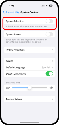 En la pantalla Spoken Content puede ver la opción Speak Selection (Leer selección). Cuando esta opción está activada, el teléfono leerá cualquier texto que esté seleccionado.