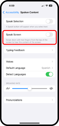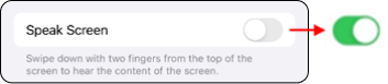 - Toque el botón de la derecha de Speak Screen (Leer pantalla en voz alta) para activar la opción.