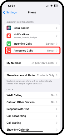 3. Toque Announce Calls (Anunciar llamadas) en la pantalla Phone (Teléfono).