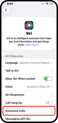 Settings (Configuración) → Siri (Siri) → Announce Calls (Anunciar llamadas) →Always (Siempre)